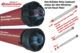 Bei den älteren Rollladen mit der alten Rollladenwelle, kann es sein das die gesteckten Kunststoffteile vom Motor nicht passen, hier muss dann der alte Mitnehmer & und Mitnehmer-Ring vom alten Motor umgebaut, weiter verwendet werden!