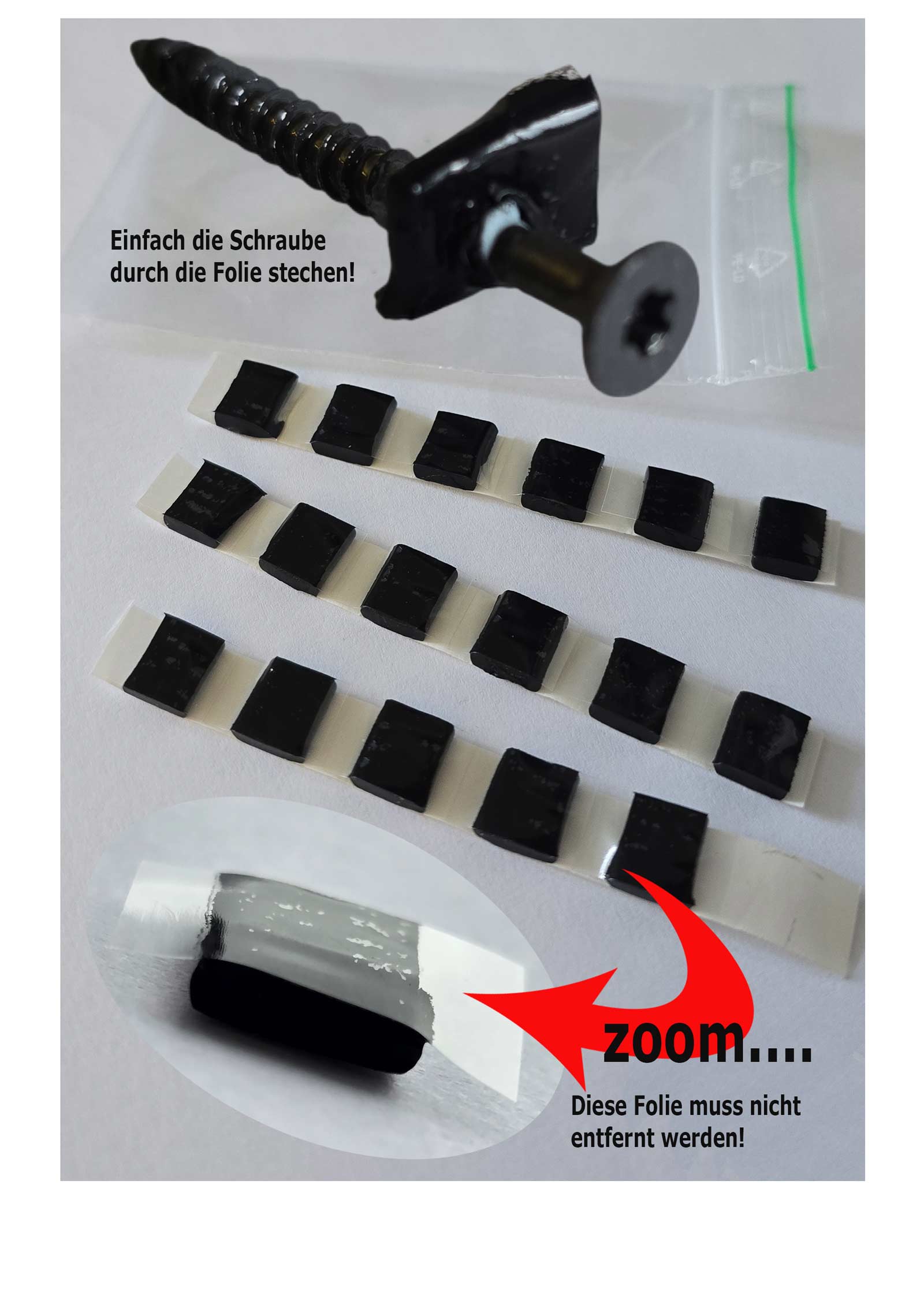 Die kleine Dichtungsabschnitte für die Schrauben, sollten auf die Schraubenlöcher aufgebracht werden, bevor die Schraube eingedreht wird.Einfacher ist es aber diese Dichtung vor dem Einschrauben, oben unter dem Schraubenkopf herum zu drehen, und dann komplett mit der Schraube eindrehen. Die Butyldichtung quillt dann beim eindrehen heraus und kann dann zusätzlich noch auf dem Schraubenkopf gedrückt werden.