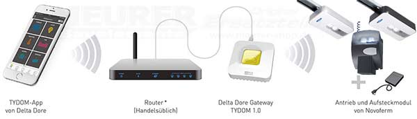 Um die TYDOM-App zusammen mit Garagentoren von Novoferm zu nutzen, wird der Garagentor-Antrieb von Novoferm über ein Gateway und ein Aufsteckmodul mit einem handelsüblichen Router verbunden. Über die Verbindung kann die App auf die Funktionen des Antriebes zugreifen und ihn steuern.